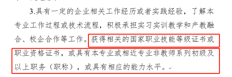 《基本標(biāo)準(zhǔn)》中要求,無論是中等職業(yè)學(xué)校教師、高等職業(yè)學(xué)校教師,還是技工院校“一體化”教師,在申報(bào)各層級(jí)“雙師型”教師時(shí),都要求教師獲得相關(guān)的國家職業(yè)技能等級(jí)證書或職業(yè)資格證書,或具有本專業(yè)或相近專業(yè)非教師系列初級(jí)及以上職務(wù)(職稱),或具有相應(yīng)的能力水平。