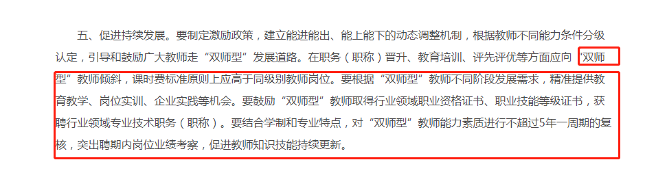 《通知》要求,要鼓勵(lì)“雙師型”教師取得行業(yè)領(lǐng)域職業(yè)資格證書、職業(yè)技能等級(jí)證書,獲聘行業(yè)領(lǐng)域?qū)I(yè)技術(shù)職務(wù)(職稱)。要結(jié)合學(xué)制和專業(yè)特點(diǎn),對(duì)“雙師型”教師能力素質(zhì)進(jìn)行不超過5年一周期的復(fù)核,突出聘期內(nèi)崗位業(yè)績考察,促進(jìn)教師知識(shí)技能持續(xù)更新。